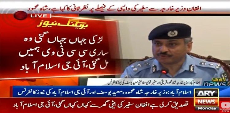 اسلام آباد میں وزیرخارجہ شاہ محمود قریشی اور مشیر قومی سلامتی امور معید یوسف کے ہمراہ پریس کانفرنس کرتے ہوئے آئی جی اسلام آباد نے کہا کہ معاملےکی تحقیقات کیلئےاپنےتمام وسائل استعمال کیے 300سےزائدکیمروں کی چھان بین کی اور 7 گھنٹے کی ویڈیوز کا جائزہ لیا۔