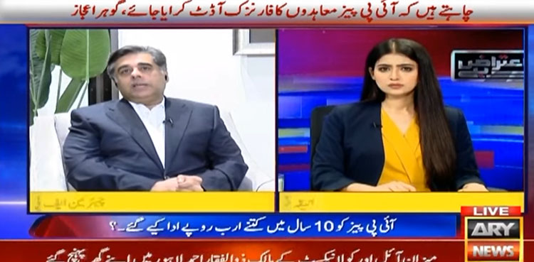 اے آر وائی کے پروگرام اعتراض میں گفتگو کرتے ہوئے سابق وزیر تجارت گوہر اعجاز نے کہا کہ سپریم کورٹ سے یہی درخواست کریں گے معاہدوں کا فارنزک آڈٹ کیا جائے، سپریم کورٹ میں پورا ڈرافٹ اور ڈیٹا پیش کریں گے، چاہتے ہیں کہ آئی پی پیز معاہدوں کا فارنزک آڈٹ کرایا جائے۔
