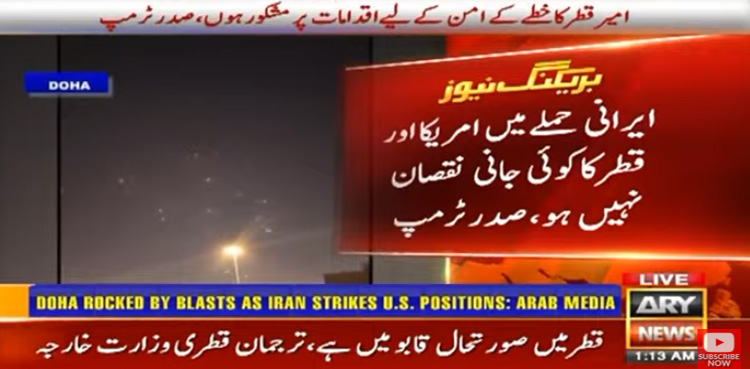 عرب میڈیا کے مطابق قطر کے دارالحکومت دوحا میں زور دار دھماکے سنے گئے۔ ایرانی میزائلوں کے داغے جانے کے بعد دوحا میں دفاعی نظام متحرک کردیا گیا ہے۔