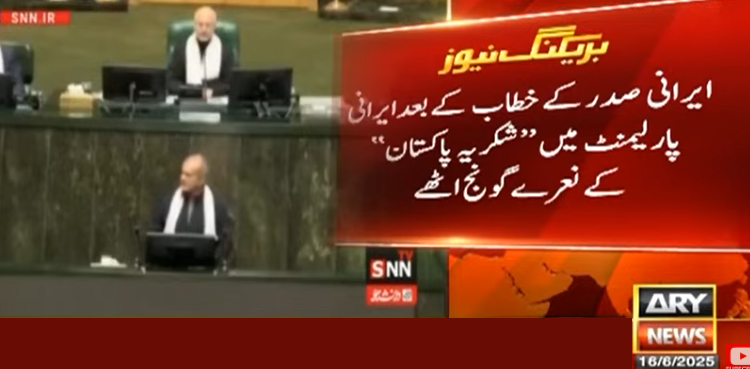 ایرانی صدر کے خطاب کے بعد ایرانی پارلیمنٹ میں ’’شکریہ پاکستان‘‘ کے نعرے گونج اٹھے۔ پاکستان تشکر! ایران کی مجلس شوریٰ میں پاکستان کےحق میں زبردست نعرے بازی کی گئی۔
