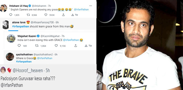 پاکستانی صحافی احتشام الحق نامی نے بھی عرفان پٹھان کو ٹیگ کرتے ہوئے طنزیہ ٹوئٹ کیا کہ ’انگلش اوپنرز کوئی گریس نہیں دکھا رہے‘۔