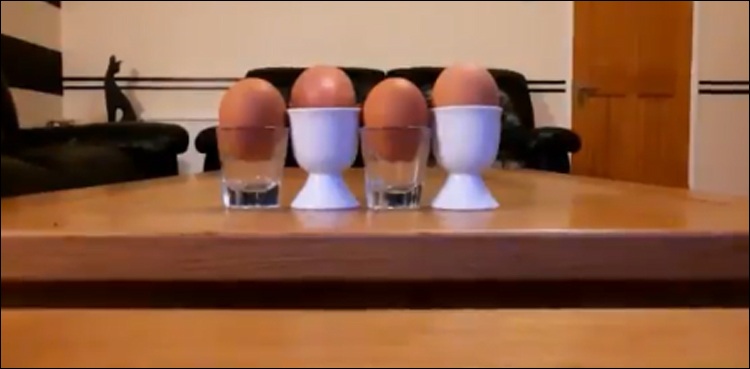 ویڈیو میں ایک میز پررکھے چار گلاسوں میں براؤن انڈے نظر آرہے ہیں، دراصل یہ چار انڈے نہیں ہیں۔ جب آپ بہت غور کریں گے اور ویڈیو کو آخر تک دیکھیں گے تو معلوم ہوگا کہ یہ تین انڈے ہیں۔