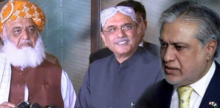 وفاقی وزیر خزانہ اسحاق ڈار کی آصف علی زرداری اور مولانا فضل الرحمان سے ملاقات ہوئی ہے جس میں انہوں نے نوازشریف کا خصوصی پیغام پہنچایا۔