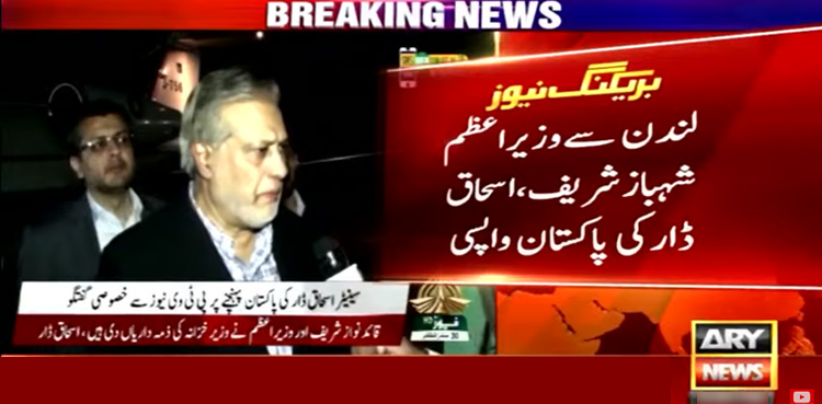 اے آر وائی نیوز کے مطابق مسلم لیگ ن کے رہنما اسحاق ڈار نے میڈیا سے گفتگو کرتے ہوئے کہا کہ ’اللہ تعالیٰ کے فضل و کرم سے اپنے وطن واپس آگیا ہوں جس طرح 99-98 اور 2013-14 میں ملک کو معاشی بھنور سے نکالا تھا اسی طرح ملک کو معاشی بھنور سے نکالنے کی کوشش کروں گا۔
