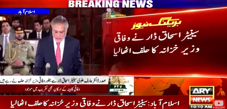 ساڑھے 4 سال بعد وطن واپس آنے والے سینیٹر اسحاق ڈار نے وفاقی وزیر خزانہ کا حلف اٹھا لیا، صدر مملکت ڈاکٹر عارف علوی نے ان سے حلف لیا۔