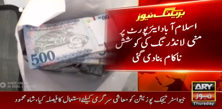 اسلام آباد انٹر نیشنل ایئرپورٹ پر منی لانڈرنگ کی کوشش ناکام بنا دی گئی۔ سعودی عرب جانے والے مسافر سے سات لاکھ بیس ہزار ریال برآمد کر لیے گئے۔