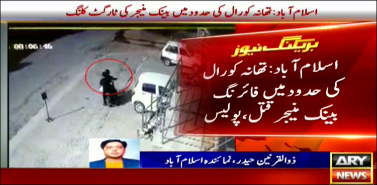 اے آر وائی نیوز کی رپورٹ کے مطابق اسلام آباد کے تھانہ کورال کی حدود میں دو نامعلوم موٹرسائیکل سواروں نے فائرنگ کرکے بینک منیجر سید رضا حسین کو قتل کردیا۔