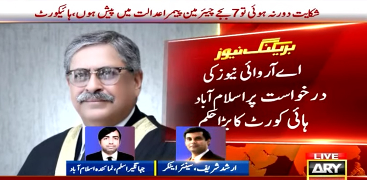 اسلام آبادہائی کورٹ نے اے آر وائی نیوز کو اپنے پرانے نمبرز پر بحال کرنے کا حکم دیتے ہوئے 4 بجے تک چیئرمین پیمرا اے آر وائی نیوزکی شکایت دور کریں، شکایت دورنہ ہوئی تو7بجےچیئرمین پیمراعدالت میں پیش ہوں۔