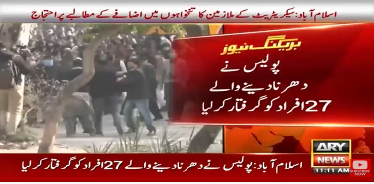 مشتعل مظاہرین کی جانب سے پولیس پر پتھراؤ کیا جارہا ہے جبکہ پولیس نے مظاہرین کو منتشر کرنے کے لئے آنسو گیس اور شیلنگ کی ہے، اس دوران پولیس نے کارروائی کرتے ہوئے چیف آرگنائزر ایمپلائز گرینڈ الائنس رحمان باجوہ سمیت ستائیس افراد کو گرفتار کرلیا ہے۔