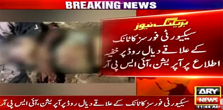 پاک فوج کے شعبہ تعلقات عامہ (آئی ایس پی آر) کے مطابق سکیورٹی فورسز نے ٹانک کے علاقےدیال روڈ پر خفیہ اطلاع پر آپریشن کیا، آپریشن کےدوران ایک خودکش بمبارماراگیا۔