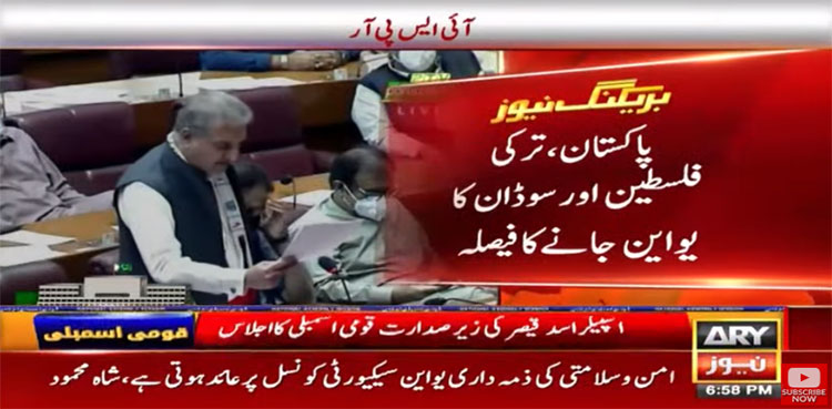 قومی اسمبلی کے اجلاس میں خطاب کرتے ہوئے وزیر خارجہ شاہ محمود قریشی نے کہا کہ آج ‏ترکی روانہ ہوں گا وہاں ترک وزیرخارجہ سےتبادلہ خیال ہوگا، فلسطینی وزیرخارجہ اور سوڈان کے ‏وزیرخارجہ بھی ترکی آئیں گے جہاں سے ہم 4ممالک کے وزرائےخارجہ نیویارک جائیں گے اور اقوام ‏متحدہ دفتر سے جنرل اسمبلی اجلاس بلانے کا مطالبہ کریں گے۔
