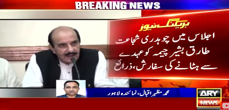 مسلم لیگ ق کی سینٹرل ورکنگ کمیٹی کے اجلاس کے حوالے سے ذرائع نے اے آر وائی نیوز کو بتایا ہے کہ ق کی سینٹرل ورکنگ کمیٹی کا اجلاس ختم ہوگیا ہے۔ سینیٹر کامل علی آغا کی زیر صدارت ہونے والے اجلاس میں پارٹی سربراہ چوہدری شجاعت حسین اور سیکریٹری جنرل طارق بشیر چیمہ کو عہدے سے ہٹانے کی سفارش کی ہے۔