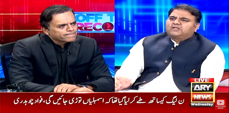 اے آر وائی نیوز کے پروگرام آف دی ریکارڈ میں گفتگو کرتے ہوئے فوادچوہدری نے کہا کہ طےہواتھاکہ ہم اسمبلی میں جائیں گے اور اسمبلیاں توڑی جائیں گی یہ بھی طےہوا تھا کہ اسمبلیاں توڑنے کے بعدالیکشن کی کال دی جائےگی لیکن راتوں رات ن لیگ اپنےمؤقف سے مکرگئی۔