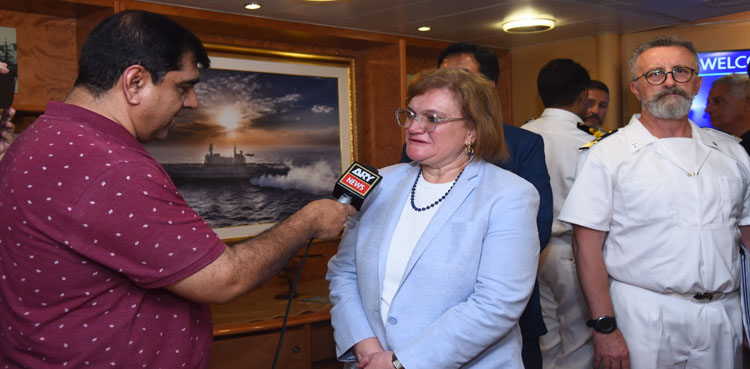 کراچی پورٹ پر میڈیا سے بات چیت کرتے ہوئے پاکستان میں تعینات اٹلی کی سفیر میریلینا ارملین نے کہا کہ یہ کسی بھی اطالوی بحری جہاز کا کراچی کا چوتھا دورہ ہے، یہ پہلی بار ہے کہ کوئی ایئرسٹرائیک کیریئر کراچی آیا ہے۔