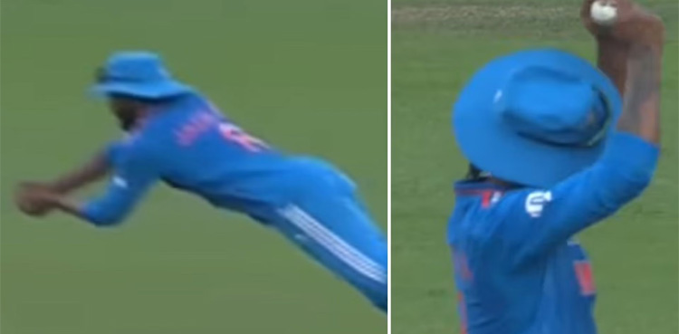 فاسٹ بولر جسپریت بمراہ کی باؤل کو بنگلہ دیشی بیٹر نے پوائنٹ کی طرفر کھیلا۔ اسی دوران وہاں کھڑے رویندر جڈیجا نے گیند کو پھرتی سے ہو میں اچک لیا۔