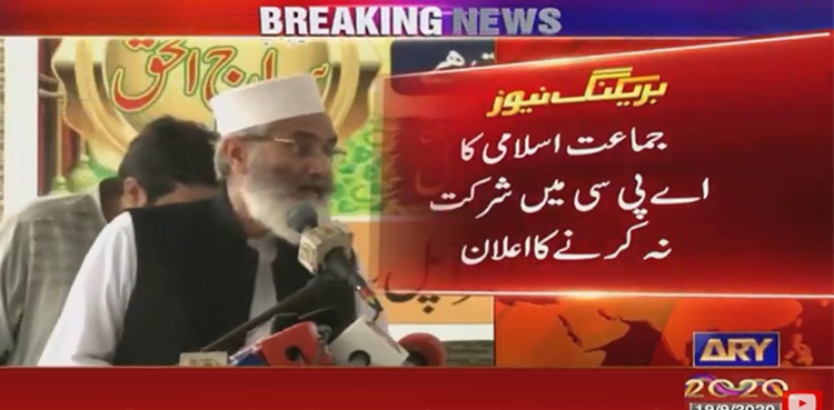 لاہور: امیر جماعت اسلامی پاکستان سینیٹر سراج الحق نے اپوزیشن کی آل پارٹیز کانفرنس میں شرکت سے انکار کر دیا۔