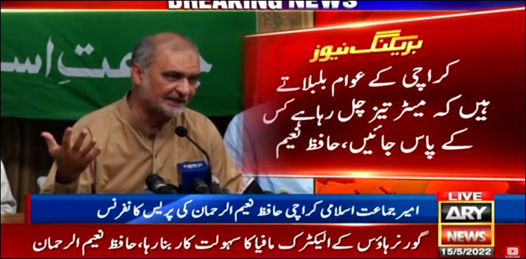 حافظ نعیم کے مطابق گورنر ہاؤس کے الیکٹرک مافیا کا سہولت کار بنا رہا، اب پھر منصوبہ بن رہا ہے کہ اس مافیا کو دوبارہ کراچی پر مسلط کیا جائے، ہم مطالبہ کرتے ہیں اس مافیا کا لائسنس کینسل کیا جائے، کراچی کے عوام بلبلاتے ہیں کہ میٹر تیز چل رہا ہے کس کے پاس جائیں۔