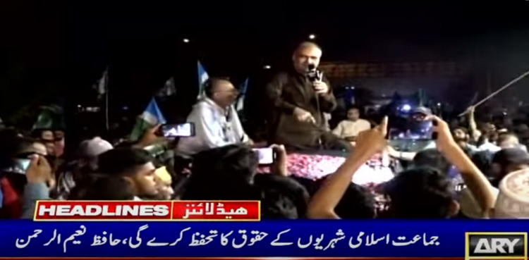 امیر جماعت اسلامی کراچی حافظ نعیم الرحمن نے کارواں کی قیادت کی اور حیدری مارکیٹ، لیاقت آباد سپر مارکیٹ سمیت مختلف مقامات پر جلسوں سے خطاب کیا، انہوں نے شہر کے مسائل کے حل کیلئے چارٹر آف ڈیمانڈ اعلان کرتے ہوئے وفاقی و صوبائی حکومتوں سے مطالبہ کیا کہ پانی کا K-4 منصوبہ فوری مکمل کیا جائے، 650 ملین گیلن پانی ساڑھے تین کروڑ عوام کا جائز اور بنیادی حق ہے اس میں کسی قسم کی کمی یا کٹوتی منظور نہیں۔