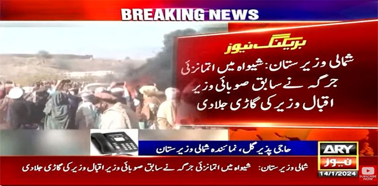 نمائندہ اے آر وائی نیوز کے مطابق شیواہ میں اتمانزئی جرگہ نے سابق صوبائی وزیر اقبال وزیر کی گاڑی جلانے کا حکم دیا۔