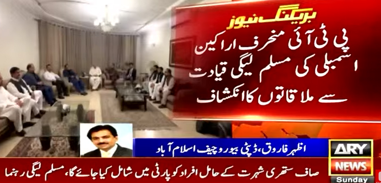 اے آر وائی نیوز کے مطابق پاکستان تحریک انصاف کے منحرف اراکین اسمبلی کے مسلم لیگی قیادت سے ملاقاتوں کا انکشاف ہوا ہے جن میں ملتان اور جنوبی پنجاب سے سات اراکین شامل ہیں جو ق لیگ میں شمولیت کے خواہشمند ہیں۔