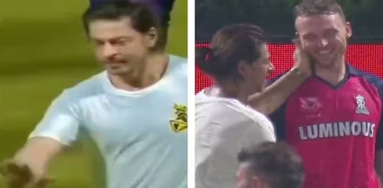 انگلینڈ کے جارح مزاج بلے باز جوز بٹلر بالی وڈ کے کنگ شاہ رخ خان کے احترام میں کھڑے ہوگئے، اداکار نے انھیں گلے لگالیا۔