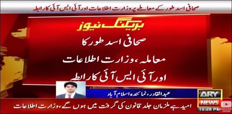 اے آر وائی نیوز کے مطابق اسلام آباد میں مقیم صحافی اسد طور پر اُن کے گھر میں ہونے والے تشدد کے معاملے پر وزارت اطلاعات اور آئی ایس آئی کے درمیان رابطہ ہوا۔