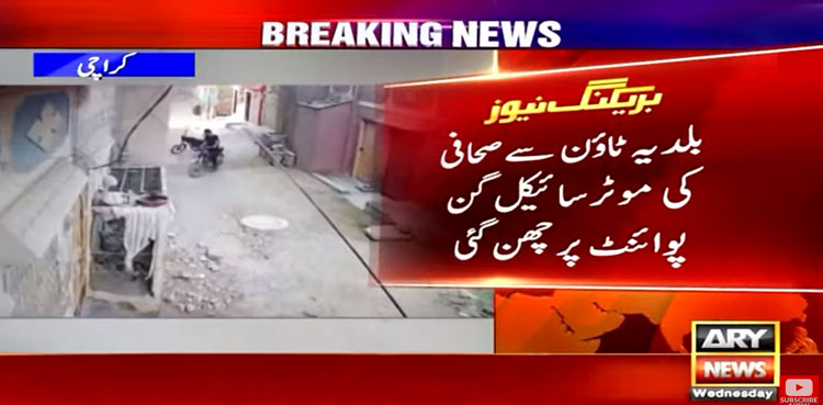 اے آر وائی نیوز کے مطابق کراچی کے علاقے بلدیہ اتحاد ٹاؤن میں صحافی کی موٹر سائیکل گن پوائنٹ پر نامعلوم مسلح افراد چھین کر لے گئے۔