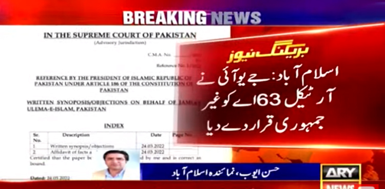 جے یو آئی کا کہنا تھا کہ آرٹیکل 63 اے پہلے ہی غیر جمہوری ہے، آزاد جیت کر شامل ہونیوالوں کی نشست بھی پارٹی کی پابند ہوجاتی ہے، ریفرنس سےلگتا ہے صدر،وزیراعظم ،اسپیکر ہمیشہ صادق وامین رہیں گے۔