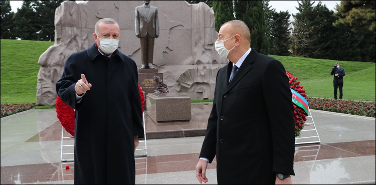 رجب طیب اردوان نے آذری صدر کے ساتھ شہدا یادگار پر پھول چڑھائے اور شہدا کے لیے فاتحہ خوانی بھی کی۔