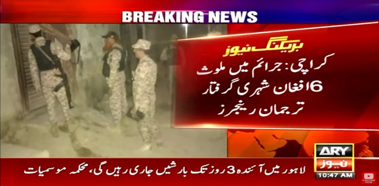 اے آر وائی نیوز کے مطابق رینجرز اور پولیس نے جمالی گوٹھ میں سرچ اینڈ کامبنگ آپریشن کرتے ہوئے جرائم میں ملوث 6 غیر ملکی افغان شہری کو گرفتار کرلیا۔