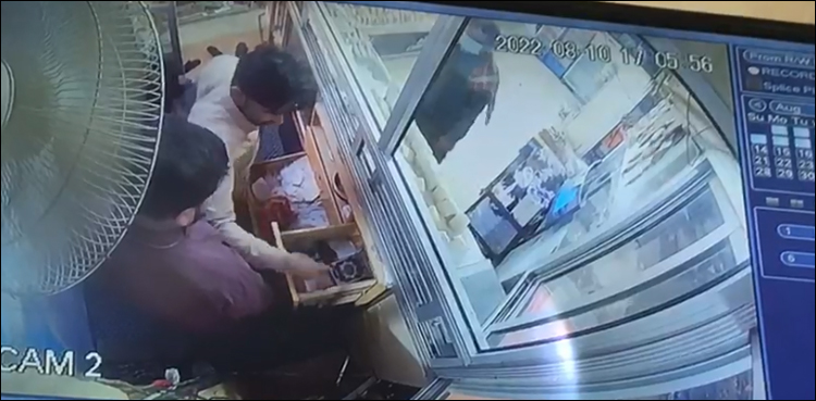 منظور کالونی کی ڈیسنٹ بیکری میں لوٹ مار کی واردات کی سی سی ٹی وی فوٹیج اے آر وائی نیوز نے حاصل کر لی، جس میں ڈاکو کو گولی چلاتے دیکھا جا سکتا ہے۔