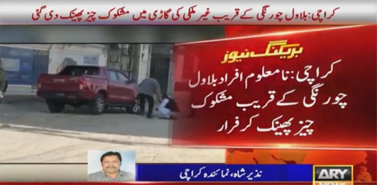 تفصیلات کے مطابق بلاول چورنگی کے قریب نامعلوم افراد غیر ملکی کی گاڑی پر مشکوک چیز پھینک کر فرار ہوئے، واقعے کے بعد بم ڈسپوزل اسکواڈ کو فوری طور پر طلب کیا گیا۔