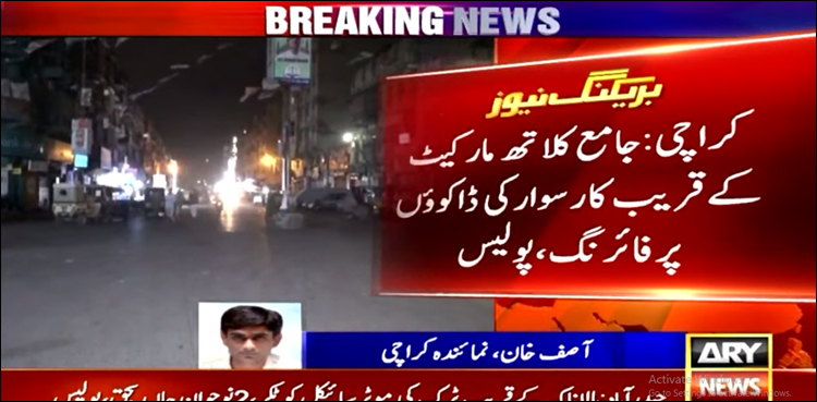 تفصیلات کے مطابق کراچی میں جامع کلاتھ مارکیٹ کے قریب ایک کار سوار کی مبینہ ڈاکوؤں پر فائرنگ سے دو ڈاکو ہلاک ہو گئے، جب کہ ایک کی حالت تشویش ناک ہے۔
