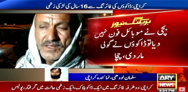 دوسری جانب زخمی لڑکی کے چچا کا کہنا ہے کہ مصباح گھروں پر کام کرتی ہے، بچی نے موبائل فون نہیں دیا تو ڈاکوؤں نے گولی مار دی، مصباح کو دو گولیاں لگی ہیں وہ اسپتال میں بیہوش ہے۔