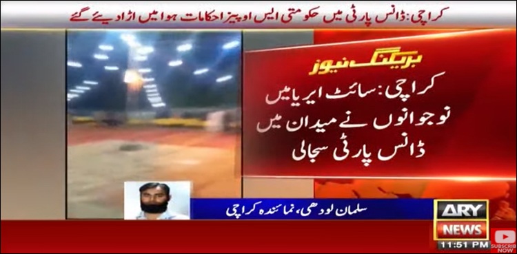 اے آر وائی نیوز کے مطابق کراچی کے علاقے سائٹ ایریا کے میدان میں مقامی نوجوانوں نے رقص کی محفل کا انعقاد کیا، جس میں 500 سے زائد شہریوں نے شرکت کی۔