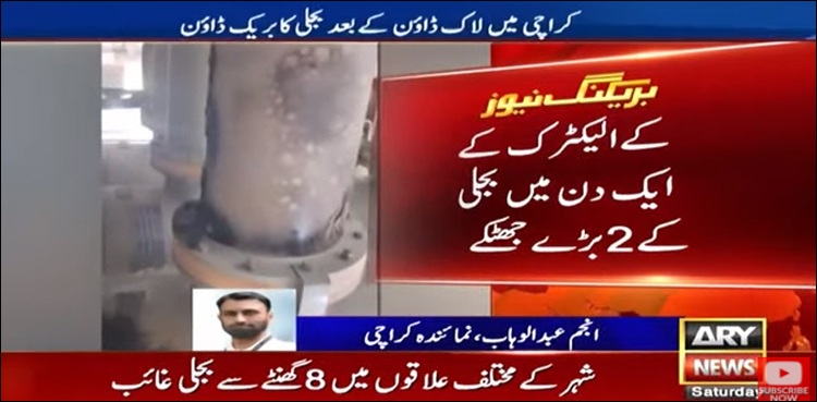 اے آر وائی نیوز کے مطابق بن قاسم پاور اسٹیشن 1 کی خرابی اور ہائی ٹینشن لائن ٹرپ ہونے کے بعد کراچی میں بجلی کا بریک ڈاؤن بحرانی صورت اختیار کرگیا ہے۔