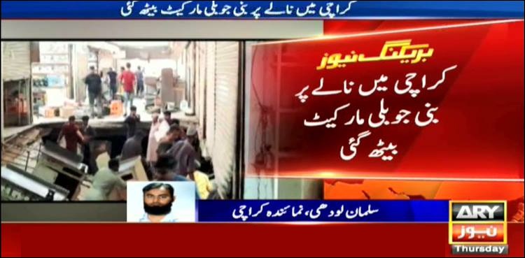 اے آر وائی نیوز کے مطابق کراچی میں قائم جوبلی مارکیٹ کے اطراف نالے پر بنیں 8 سے 10 دکانیں زمین بوس ہوگئیں جس کے نتیجے میں متعدد دکانوں اور راستے کو نقصان پہنچا۔