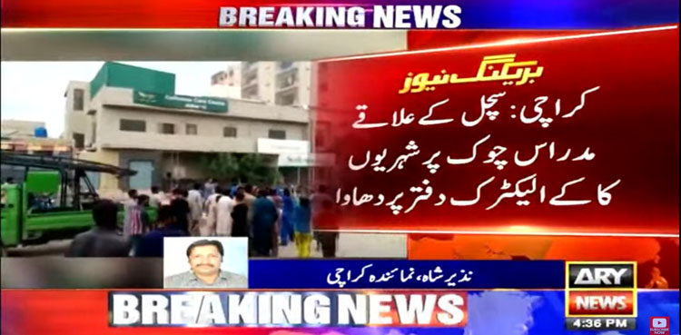 اے آر وائی نیوز کے مطابق کراچی کے مختلف علاقوں میں بجلی کی عدم فراہمی پر شہریوں کی جانب سے احتجاج کا سلسلہ جاری ہے اب مدراس چوک پر مشتعل مظاہرین کے الیکٹرک کے دفتر پہنچے اور دفتر پر دھاوا بول دیا۔