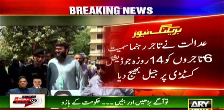 پیشی پر پولیس نے عدالت سےملزمان کےجسمانی ریمانڈکی استدعا کی اور کہا ملزمان پر لاک ڈاؤن کی خلاف ورزی، لوگوں کو اکسانے کا الزام ہے، جس پر عدالت نے تاجروں کے وکلا کی درخواست ضمانت مسترد کرتے ہوئے تاجر رہنما سمیت 6تاجروں کو 14روزہ جوڈیشل ریمانڈپر جیل بھیج دیا۔
