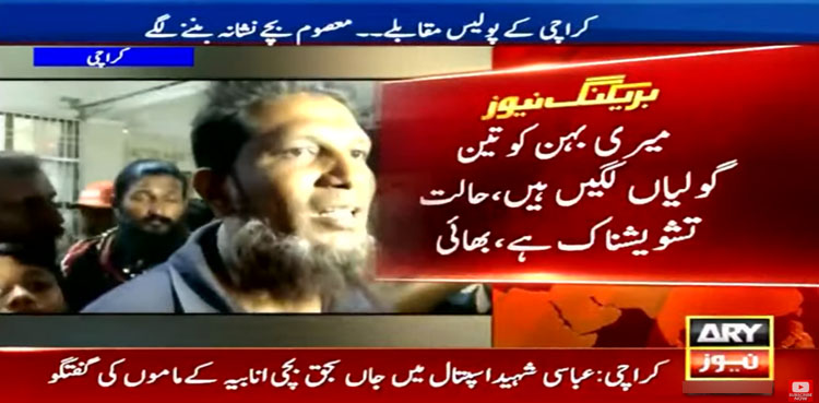 اے آر وائی نیوز کے مطابق شہر قائد کے علاقے نارتھ ناظم آباد بلاک ایم میں پولیس اور ڈاکوؤں کے درمیان مبینہ مقابلے کے دوران فائرنگ سے چنگ چی رکشے میں سوار 9 ماہ کی انابیہ جاں بحق جبکہ ماں زخمی ہوگئی۔