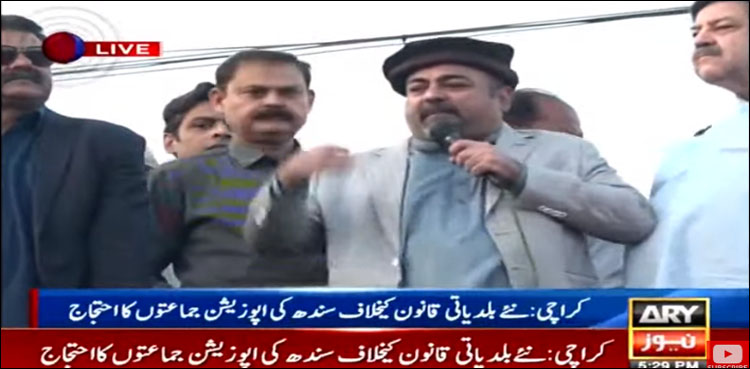 احتجاجی مظاہرے سے خطاب کرتے ہوئے خواجہ اظہار کا کہنا تھا کہ اگرنیا بلدیاتی قانون اتنا اچھا قانون ہےتو وزیراعلیٰ سندھ ہمیں سیہون کے دورے پربلالیں۔