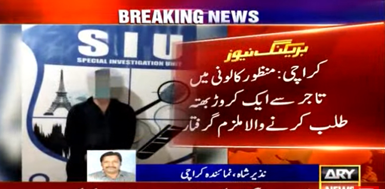 تفصیلات کے مطابق کراچی میں ایس آئی یو پولیس نے منظور کالونی میں خفیہ اطلاع پر کارروائی کی ، کارروائی کے دوران تاجر سے ایک کروڑ بھتہ طلب کرنے والے ملزم کو گرفتار کرلیا۔