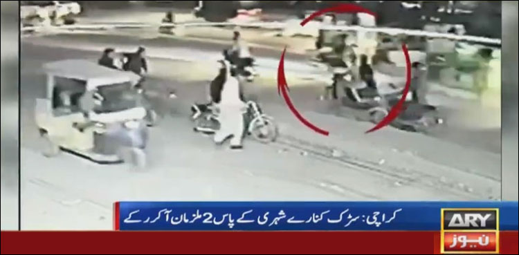 سی سی ٹی وی فوٹیج میں دیکھا جاسکتا ہے کہ سڑک کنارے کھڑے شہری کے پاس دو ملزمان آکر رکے اور لوٹ مار شروع کردی اس دوران سروس روڈ سے گزرنے والے پولیس اہلکار بھی پہنچ گئے، ملزمان نے پولیس کو دیکھ کر بھاگنے کی کوشش کی جسے پولیس نے ناکام بنادیا۔