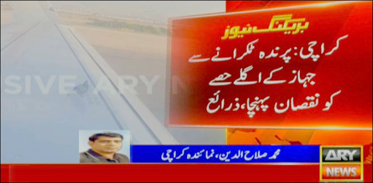 نمائندہ اے آر وائی نیوز صلاح الدین کے مطابق کراچی سے بحرین جانے والی نجی ایئرلائن کی پرواز ٹیک آف کررہی تھی کہ اسی دوران جہاز سے پرندہ ٹکرا گیا۔کپتان نے ذہانت سے کام لیتے ہوئے ٹیک آف پوائنٹ پر ایمرجنسی بریک لگا کر جہاز کو روکا جس کے بعد انجینئرز نے معائنہ بھی کیا۔ پرندہ ٹکرانے کی وجہ سے جہاز کے اگلے حصے کو نقصان پہنچا۔