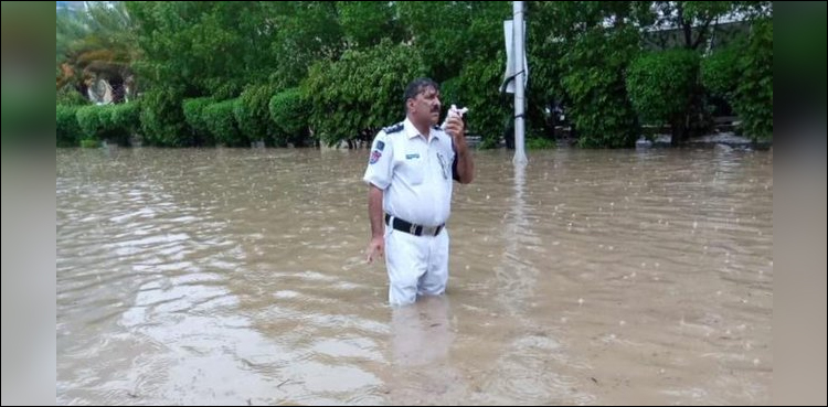 علاوہ ازیں چند ٹریفک پولیس اہلکار ایسے بھی تھے جو نکاسی کے لیے پانی کا راستہ بنا رہے تھے۔