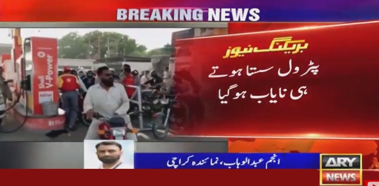 اے آر وائی نیوز کی رپورٹ کے مطابق کراچی کے مختلف پیٹرول پمپس نے پیٹرول کی فراہمی بند کردی جس کے بعد مختلف پیٹرول پمپس پر گاڑیوں کی لمبی قطاری لگ گئیں۔
