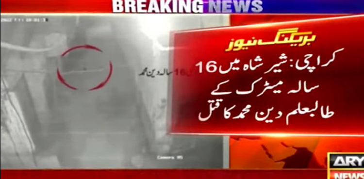 اے آر وائی نیوز کے مطابق کراچی کے علاقے شیر شاہ میں 16 سالہ طالب علم دین محمد کے قتل کا واقعہ گزشتہ رات پیش آیا، ڈاکوؤں نے مزاحمت کرنے پر خاندان کی کفالت کرنے والے بچے کے پیٹ میں گولیاں ماردیں۔