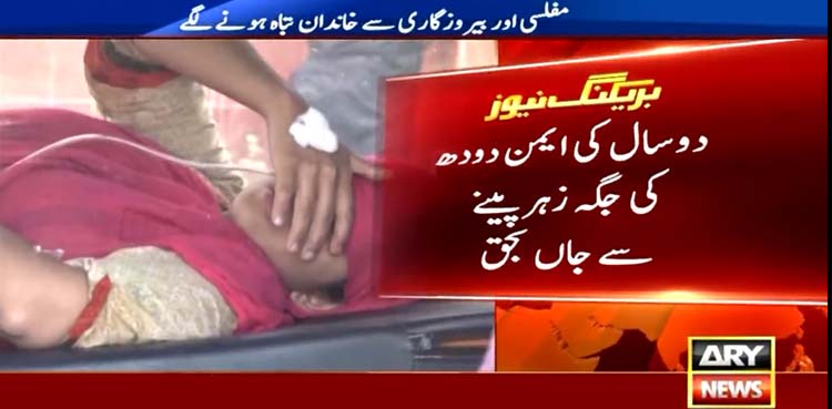 اہلخانہ کو بیہوشی کی حالت میں عباسی شہید اسپتال منتقل کیا گیا جہاں دو سال کی بچی ام ایمن دودھ کی جگہ زہر پینے سے جاں بحق ہوگئی ہے۔