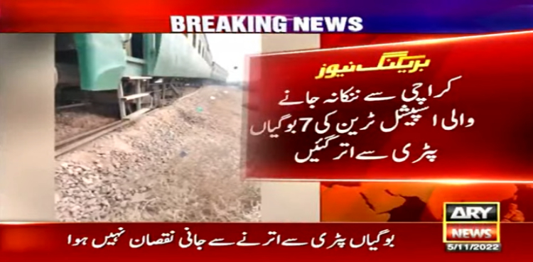 تفصیلات کے مطابق کراچی سےننکانہ جانے والی اسپیشل ٹرین کی7بوگیاں پٹری سےاتر گئیں، ٹرین کی بوگیاں شور کوٹ کے قریب پٹری سے اتریں جس میں کوئی جانی نقصان نہیں ہوا۔