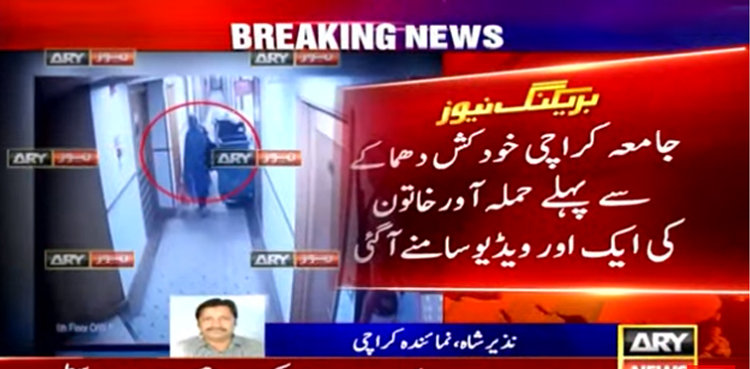 کراچی : جامعہ کراچی میں دھماکے سے قبل مبینہ خودکش خاتون کی ایک اور ویڈیو سامنے آگئی، جس میں دیکھایا گیا ہے کہ خاتون مبینہ طور پر آخری بار ہوٹل میں اپنے شوہر سے ملنے گئی تھی۔